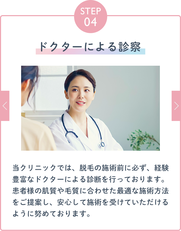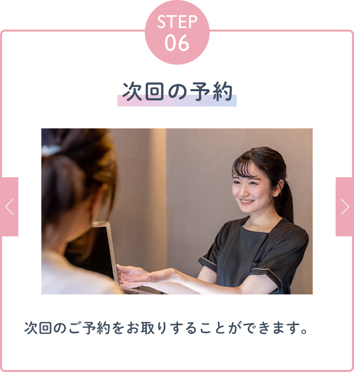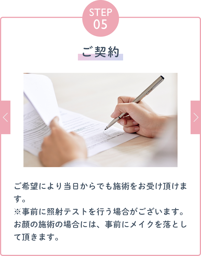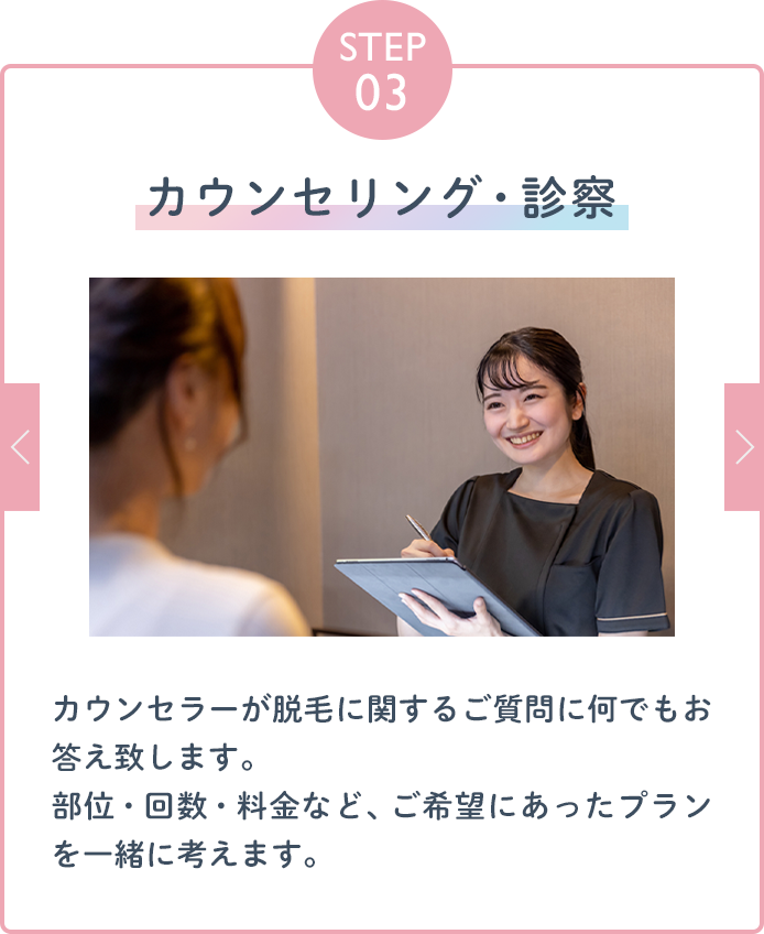 まずはカウンセリングで脱毛コースについてしっかりとご説明させて頂き、ご納得頂いた場合のみご契約にお進み頂きます。