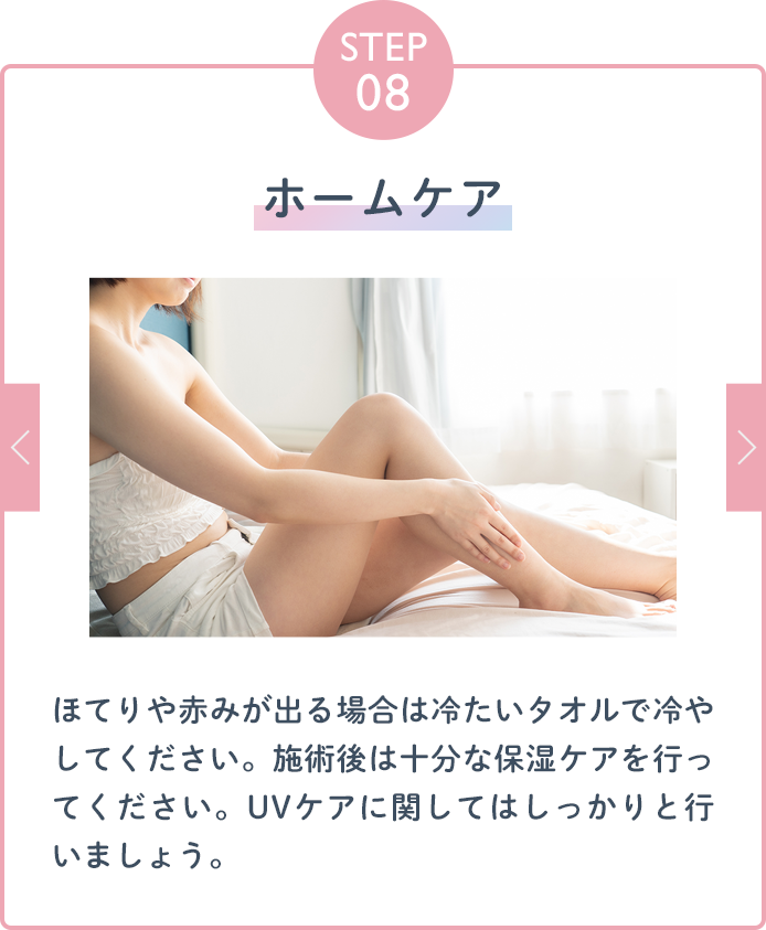 | ダウンタイム | 照射直後、赤み・熱感・かゆみ・痛み・乾燥などが生じる可能性があります。通常、数日程度で治りますが、治らない場合は医師の診察行っております。 また、施術はしっかりと保湿を行ってください。 |
